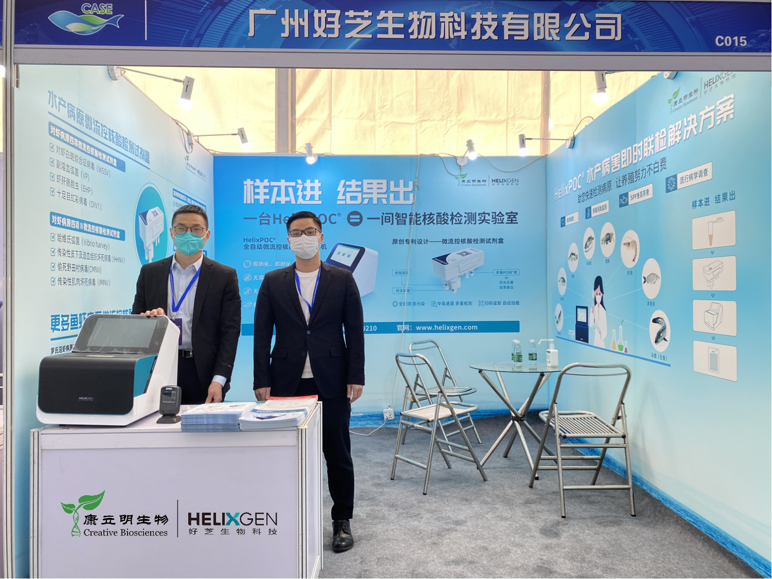 本次展會(huì),康立明生物全資子公司好芝生物攜帶HelixPOC®全自動(dòng)微流控?zé)晒?/span>PCR一體機(jī)及HelixPOC®水產(chǎn)病原微流控核酸檢測(cè)試劑盒赴展。