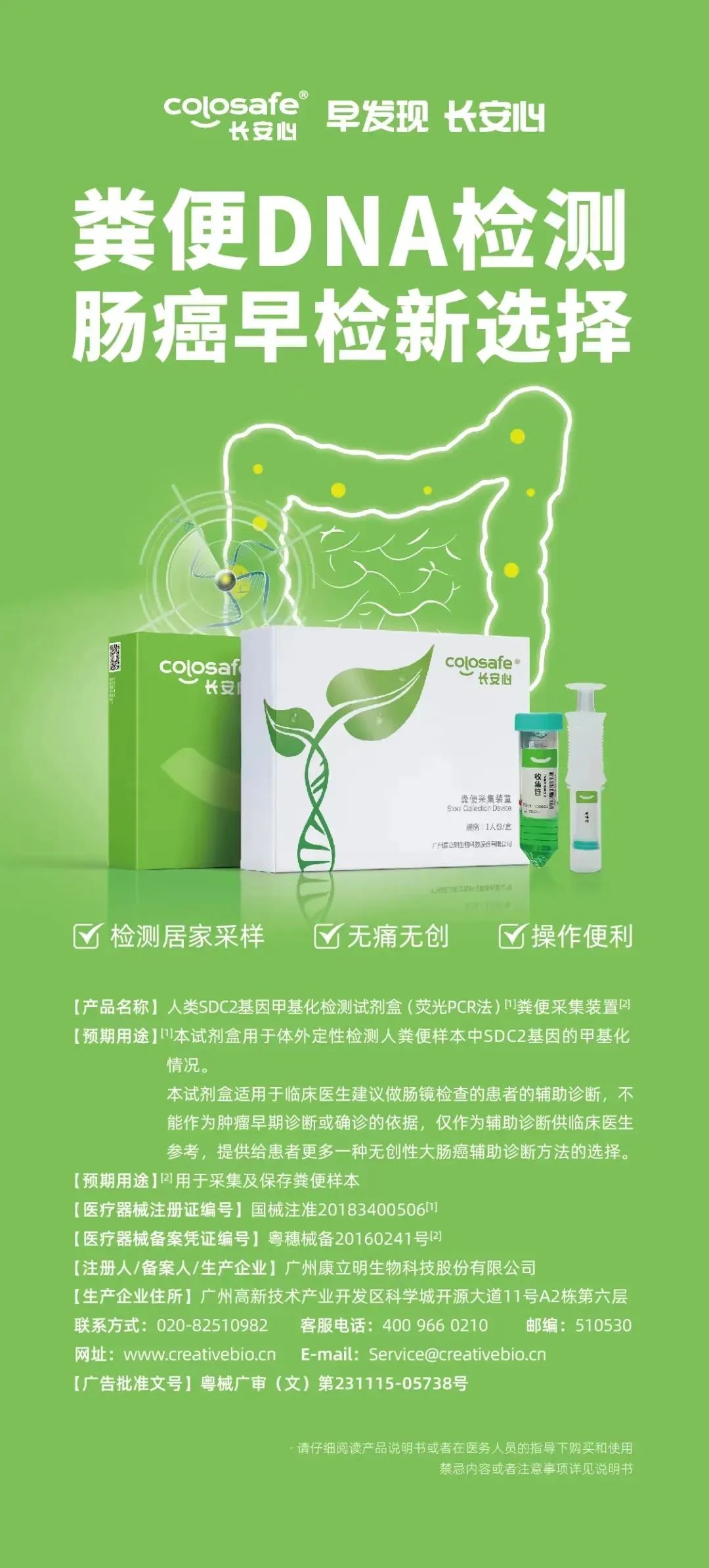 長(zhǎng)安心®人類SDC2基因甲基化檢測(cè)試劑盒(熒光PCR法)于2018年11月20日獲國(guó)家藥監(jiān)局頒發(fā)的三類醫(yī)療器械注冊(cè)證書(shū),是中國(guó)率先獲批上市的腸癌糞便基因檢測(cè)試劑盒,成為國(guó)內(nèi)腸癌無(wú)創(chuàng)DNA檢測(cè)破冰之作。長(zhǎng)安心®糞便基因檢測(cè)通過(guò)解讀糞便中脫落腫瘤細(xì)胞的基因異常改變,幫助醫(yī)生發(fā)現(xiàn)患者早期腸癌病變情況,有希望將結(jié)直腸癌阻斷在早期階段,從而達(dá)到預(yù)防和根治結(jié)直腸癌的目的。