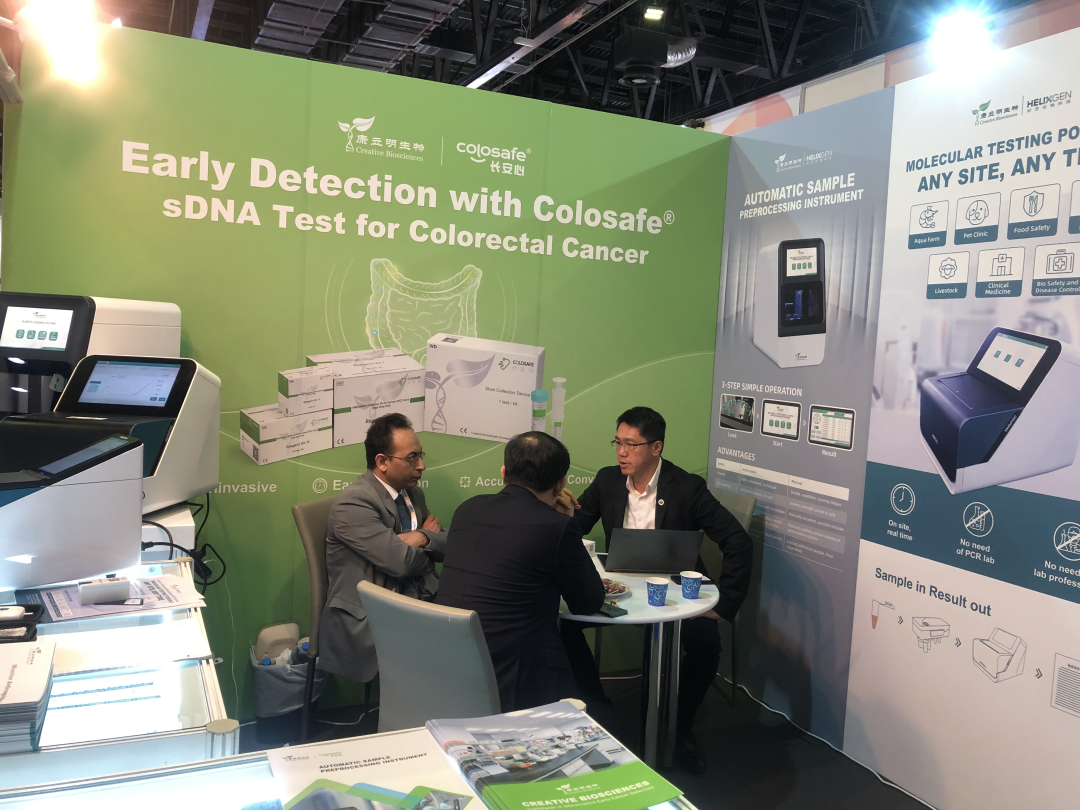 展會上,康立明生物創(chuàng)始人、腸癌早篩技術(shù)發(fā)明人鄒鴻志博士親臨現(xiàn)場,并帶領(lǐng)專業(yè)團隊為多方客戶熱情專業(yè)的講解,共同交流,洽談合作。并介紹了長安心®目前在國內(nèi)568051例應(yīng)用檢測(截至2022年12月31日)的成功模式與經(jīng)驗。