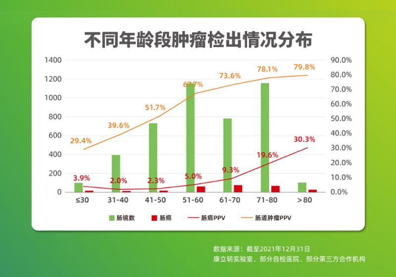 截至2021年12月,長(zhǎng)安心®共完成33萬(wàn)例前瞻性篩查,其中175528例篩查數(shù)據(jù)可追溯,12114例受檢者長(zhǎng)安心®檢測(cè)結(jié)果陽(yáng)性(陽(yáng)性率6.9%),其中4970例長(zhǎng)安心®檢測(cè)結(jié)果陽(yáng)性的受檢者進(jìn)行了腸鏡復(fù)查(腸鏡依從性41.0%),一共發(fā)現(xiàn)3408例需要治療的受檢者,其中755例腸癌,1444例腺瘤,1209例息肉。長(zhǎng)安心®對(duì)腸道腫瘤的陽(yáng)性預(yù)測(cè)值(PPV)為68.6%(其中腸癌的陽(yáng)性預(yù)測(cè)值為15.2%)。